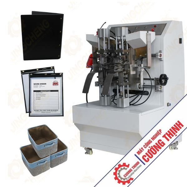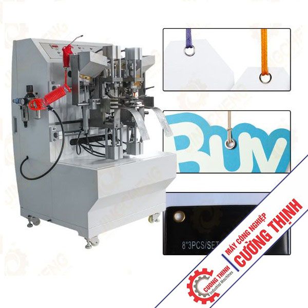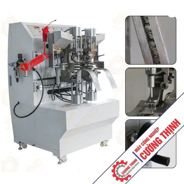 Máy khoen bốn đầu: Đục bốn lỗ có kích thước nhỏ và ép chặt bốn khoen kim loại trên các loại vải hoặc vật liệu có độ dày từ mỏng đến trung bình bằng khuôn tùy chỉnh. Máy có thể bấm bốn khoen một lúc nên hiệu quả và năng suất cao gấp bốn lần so với máy một đầu